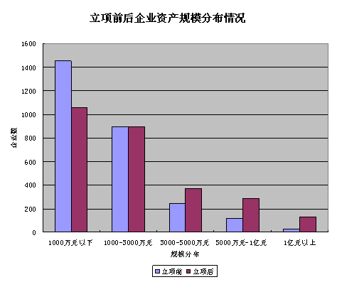 项目实施期间,企业通过自身经营、追加投资和外部融资等不同资本运作方式,资产规模得到不同程度的增长。企业资产规模分布统计结果显示,立项前,资产规模在1000万元以下的有1455家,在3000万元以上的有389家、占企业总数的14.21%,其中1亿元以上有26家。经过几年时间的经营,约有80%的企业资产规模实现不同程度的增长,总资产达到3000万元以上的企业有789个,占企业总数的28.82%,比立项时提高了14.61个百分点,其中资产在1亿元以上的企业上升至132家。