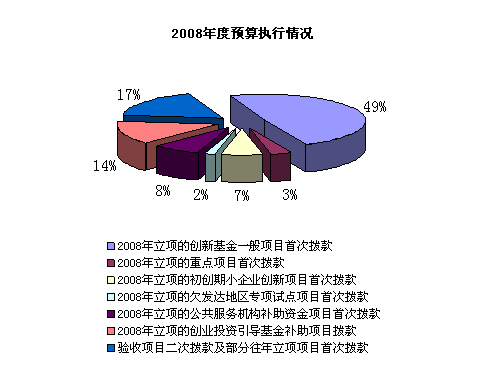 2008年立项的创新基金一般项目首次拨款68332万元(其中:无偿资助项目拨款61754万元,贷款贴息项目拨款6578万元),占预算资金总额的49%;2008年立项的重点项目首次拨款4718万元,占预算资金总额的3%;2008年立项的初创期小企业创新项目首次拨款9462万元,占预算资金总额的7%;2008年立项的欠发达地区专项试点项目首次拨款2227万元,占预算资金总额的2%;2008年立项的服务机构补助资金项目首次拨款10990万元,占预算资金总额的8%;2008年立项的创业投资引导基金项目拨款20000万元(含股权投资项目的10000万元),占预算资金总额的14%;验收项目二次拨款及部分往年立项项目首次拨款合计24271万元,占预算资金总额的17%。