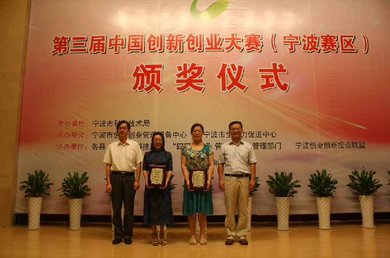 港隆重举行。经过3个多月的宣传发动、审核确认、初赛评审、复赛评审、培训辅导、决赛答辩,最终共有12家企业获奖。其中宁波南车新能源科技有限公司荣获初创企业组一等奖, 宁波复卿环保科技有限公司、宁波华瓷通信技术有限公司荣获初创企业组二等奖,宁波博科信息科技有限公司、宁波甬菱德盟新材料有限公司和宁波普利达智能科技应用有限公司荣获初创企业组三等奖;宁波斗士油压有限公司荣获成长企业组一等奖,宁波中物光电杀菌技术有限公司、宁波高新区纯丽节能技术有限公司荣获成长企业组二等奖,宁波邻家网络科技有限公司、宁波丰沃涡轮增压系统有限公司、宁波鱼化龙机电科技有限公司荣获成长企业组三等奖。宁波市科技局局长黄利琴、宁波市科技局副局长龚国文、宁波国家高新区管委会副主任崔秀良、宁波市科技局对外科技合作处处长杨建艇、宁波市创新创业管理服务中心主任吕锡云和宁波市生产力促进中心主任王剑荣分别为他们颁奖。