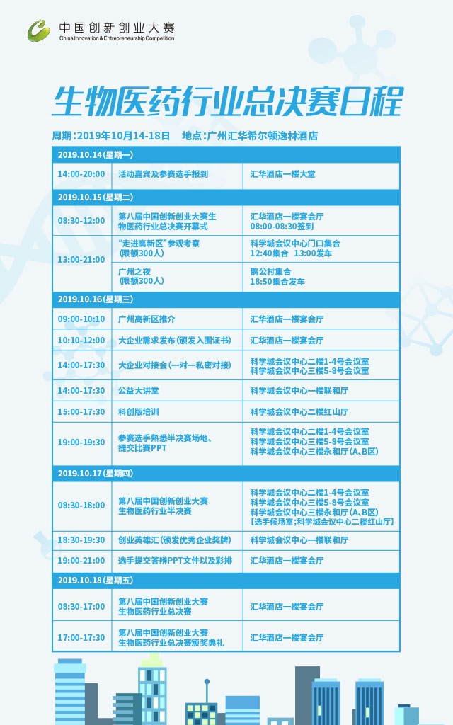 国庆节后的10月15日,第八届中国创新创业大赛全国总决赛开幕式将在广州举行。10月14—18日,生物医药行业总决赛作为首场全国总决赛,将在广州率先开赛。随后,电子信息(10月28-31日)、先进制造(11月4-7日)、新材料(11月9-12日)、互联网(11月18-21日)、新能源及节能环保(11月25-28日)行业总决赛,将陆续在深圳、洛阳、大连、杭州、宜春进行。