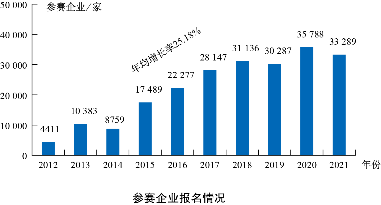 十年来,中国创新创业大赛累计吸引参赛企业和团队超过24万家(个),其中企业报名总数占比近九成。从2018年开始,年度参赛企业连续4年突破3万家,其中第十届大赛收到33289家企业报名,这一数字是十年前的7.5倍,参赛企业年均增长25.18%。