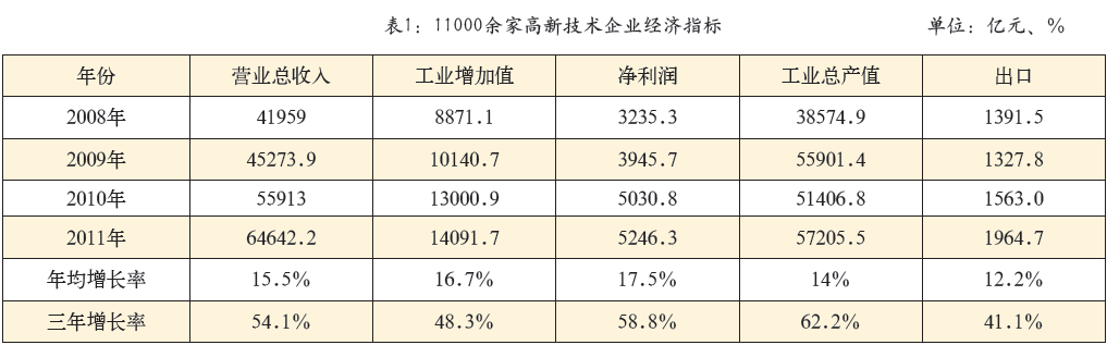 高新技术企业群体经济效益增长显著。据对11000余家高新技术企业统计,2011年,高新技术企业盈利面为99%,远高于全国54%的水平;其在总收入、工业总产值、工业增加值、净利润和出口等方面的经济贡献均保持快速增长,年均增长率都在12%以上,最高达到17.5%。与2008年比较,2011年各经济贡献指标的增幅都在41个百分点以上,最高达到62个百分点。