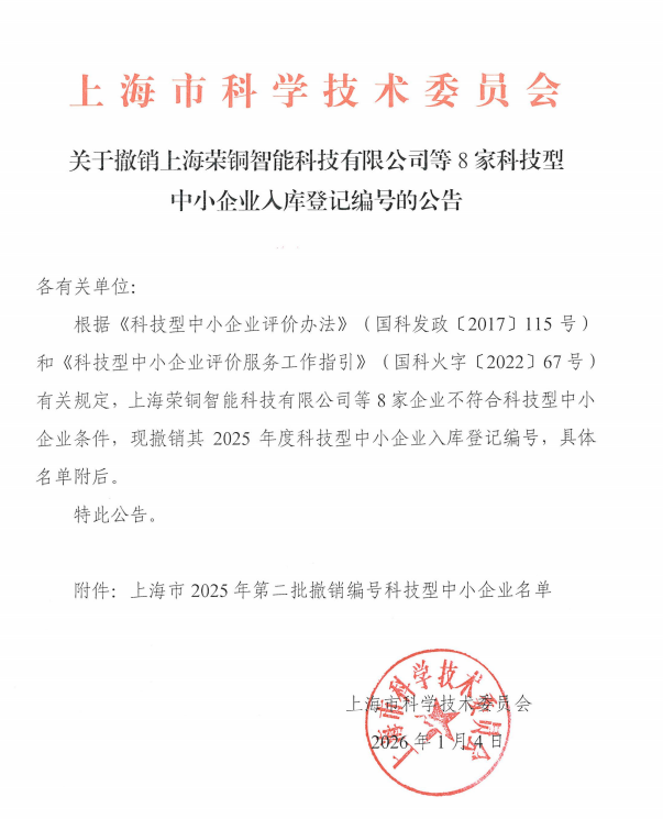 上海市2025年第2批撤销编号科技型中小企业名单公告
