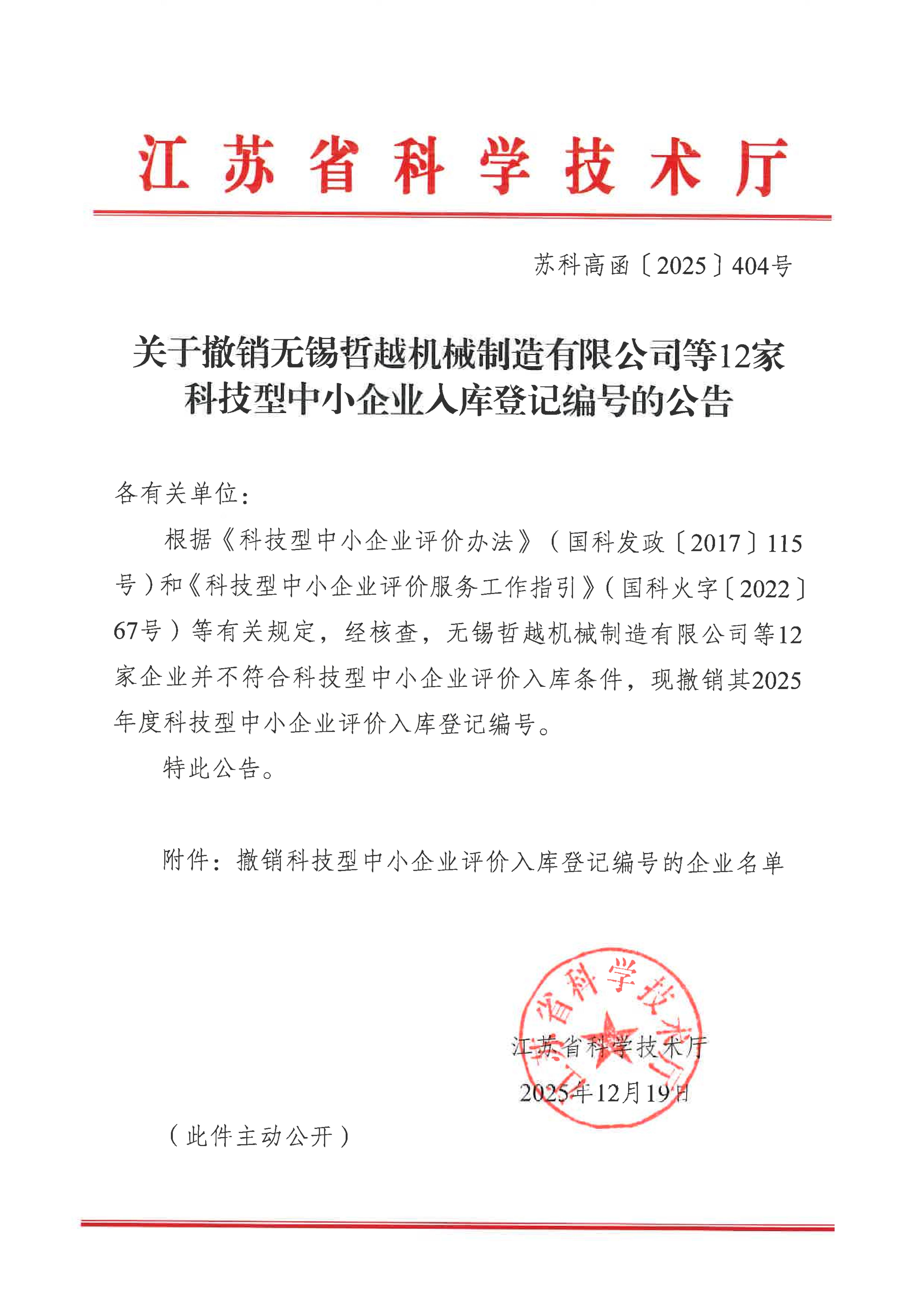关于撤销无锡哲越机械制造有限公司等12家科技型中小企业入库登记编号的公告.jpg PICTURE
