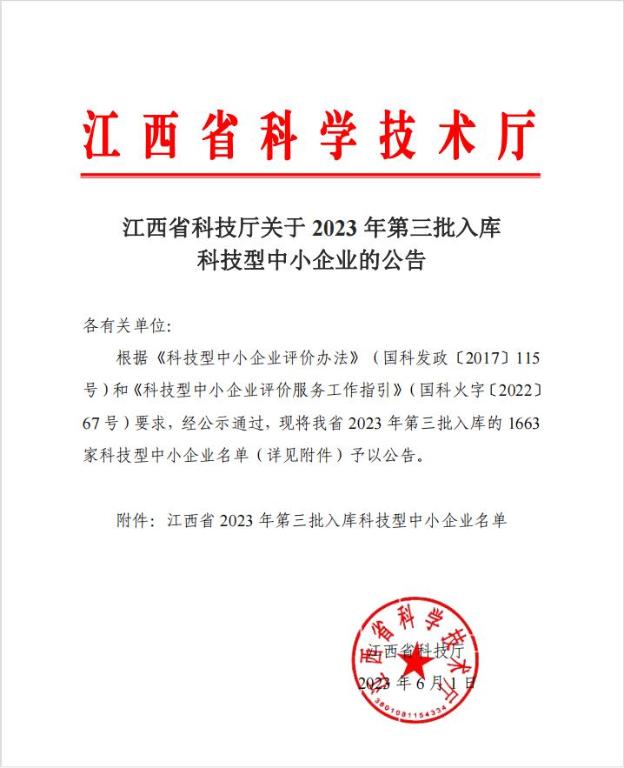 江西省2023年第3批入库科技型中小企业名单公告正文.jpg PICTURE