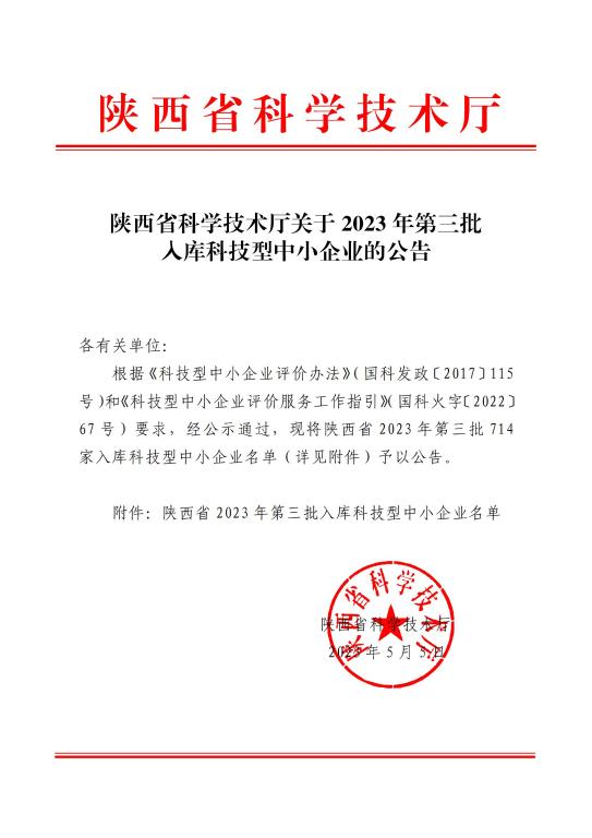 陕西省2023年第3批入库科技型中小企业名单公告正文.jpg PICTURE