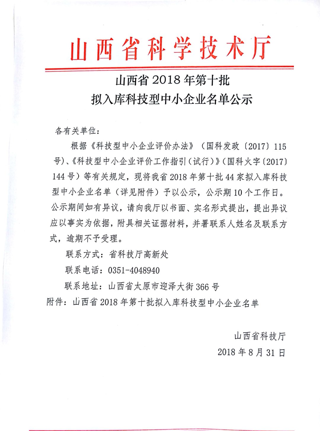 山西省2018年第一十零批拟入库科技型中小企业名单公示正文.jpg PICTURE