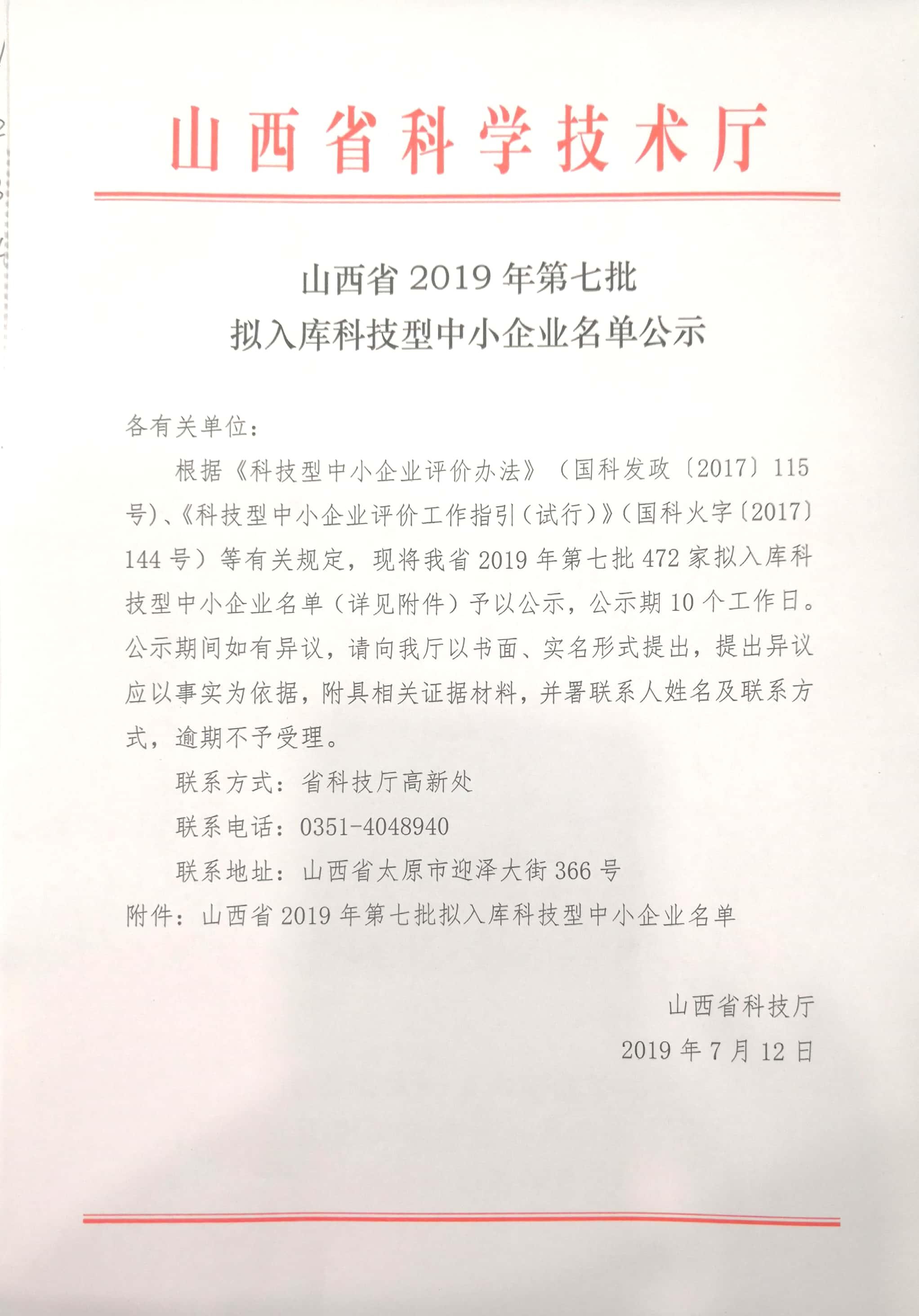 山西省2019年第七批拟入库科技型中小企业名单公示正文.jpg PICTURE