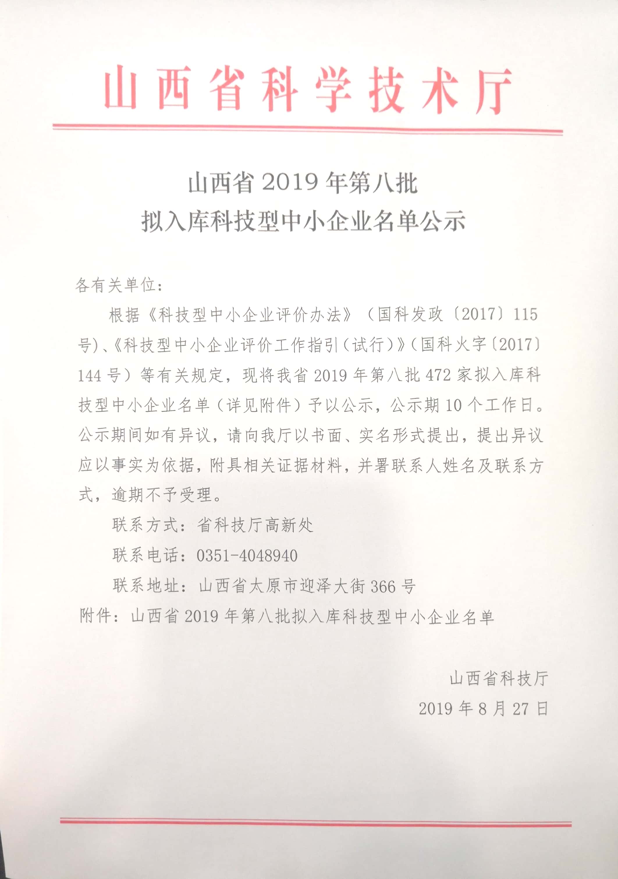 山西省2019年第八批拟入库科技型中小企业名单公示正文.jpg PICTURE