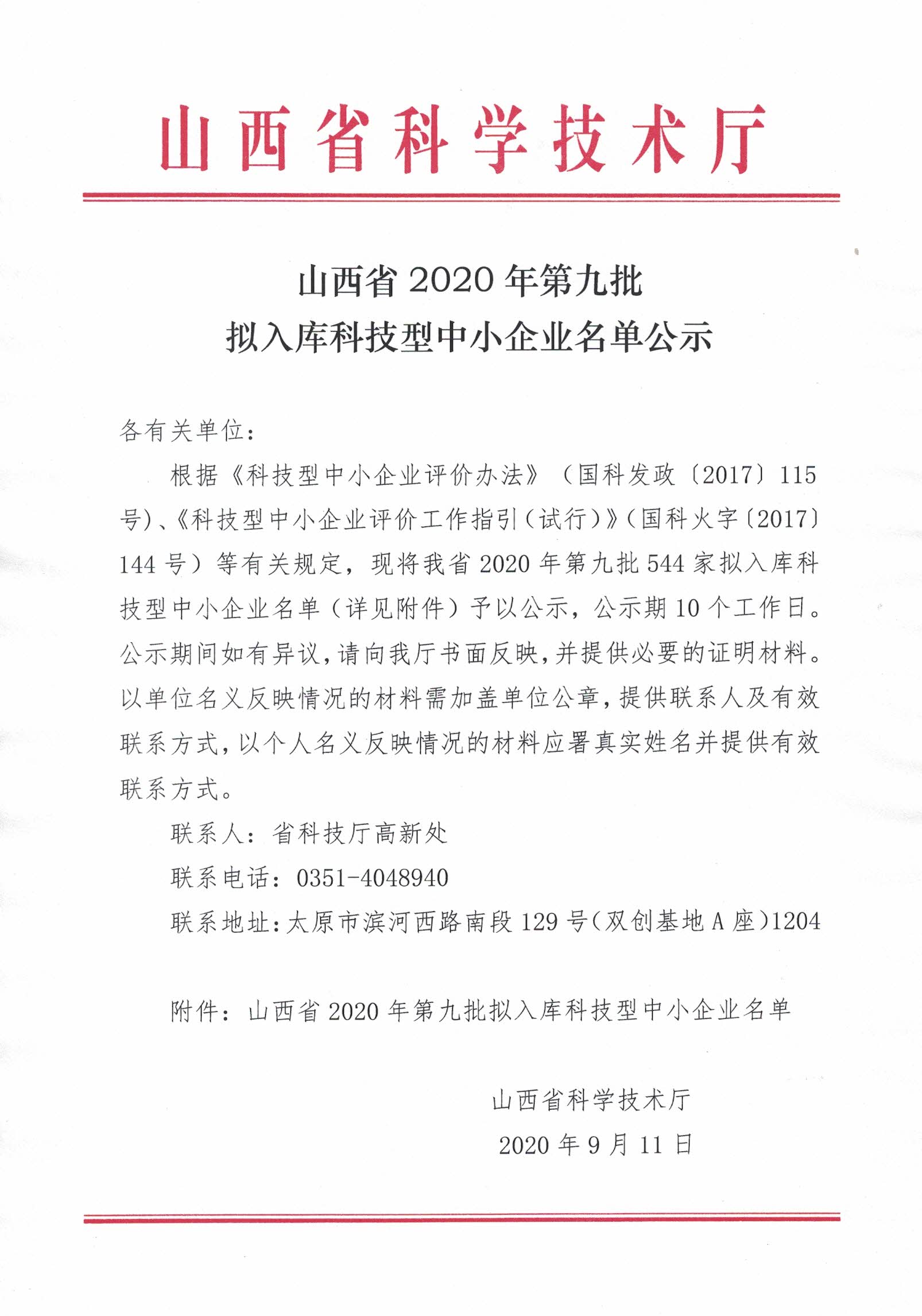 山西省2020年第九批拟入库科技型中小企业名单公示正文.jpg PICTURE