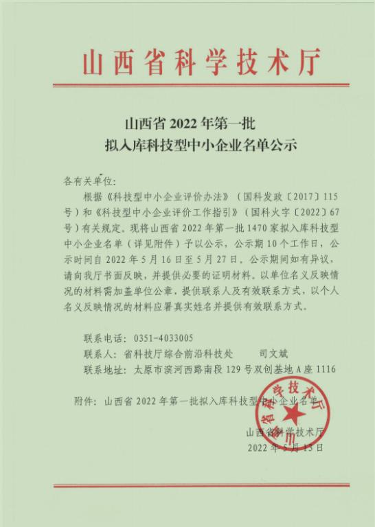 山西省2022年第1批拟入库科技型中小企业名单公示正文.jpg PICTURE