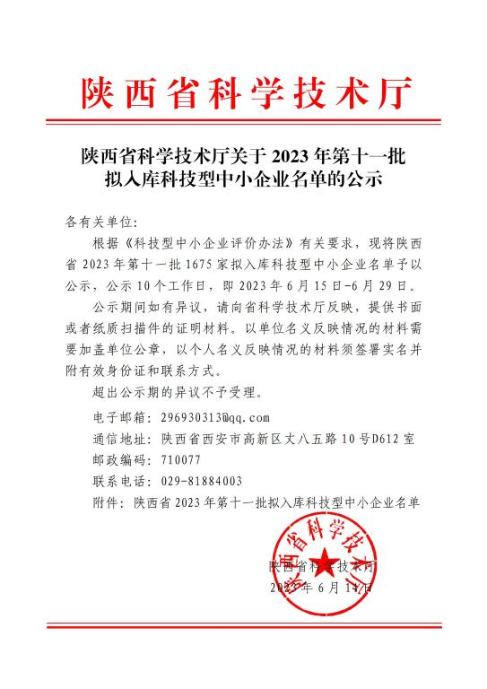 陕西省科学技术厅关于2023年第十一批拟入库科技型中小企业名单的公示 正文_00.jpg PICTURE