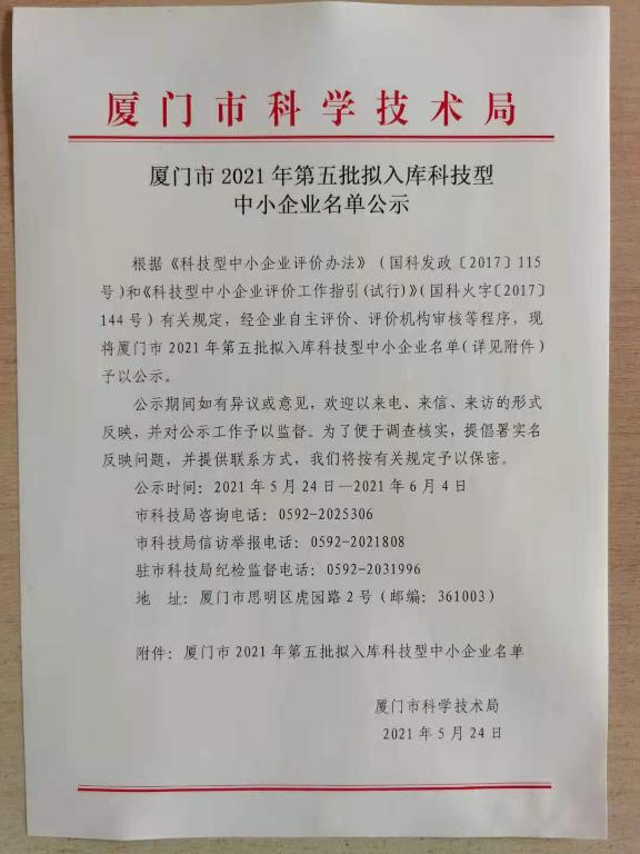 厦门市2021年第5批拟入库科技型中小企业名单公示正文.jpg PICTURE