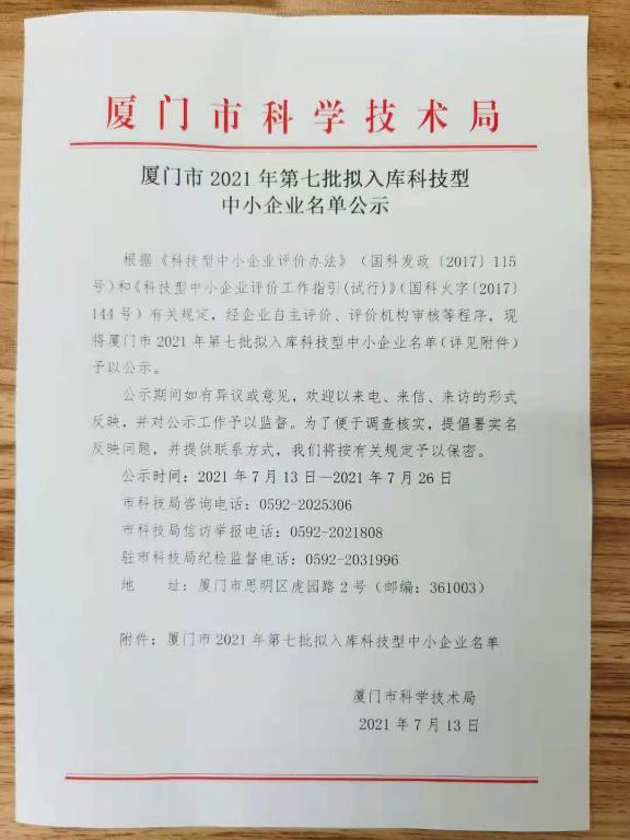 厦门市2021年第7批拟入库科技型中小企业名单公示正文.jpg PICTURE